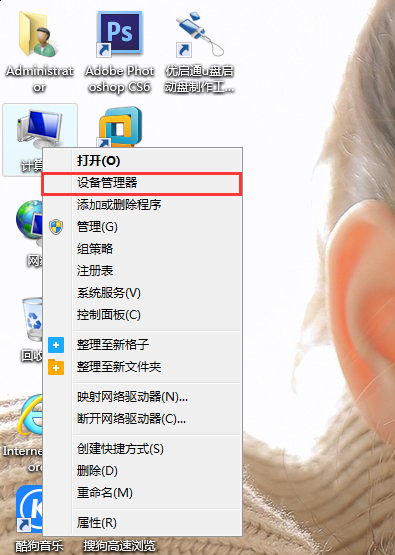 1、将鼠标置于桌面“计算机”图标上,按右键选择“设备管理器”。如图所示: