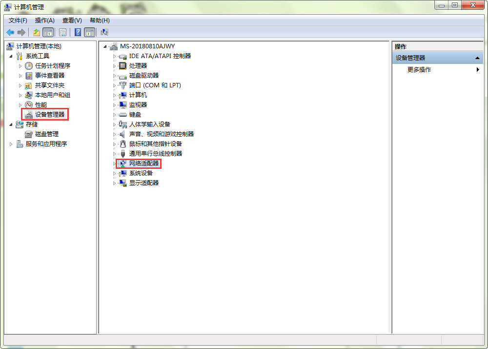 2、打开计算机管理窗口后,点击左侧的“设备管理器”,然后再在右侧选择打开“网络适配器”选项。如图所示:
