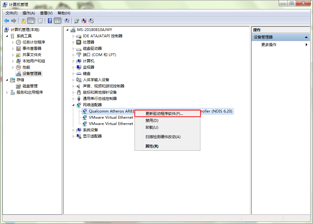 3、双击打开“网络适配器”选项后,选择网卡进行更新。点击右键选择“更新驱动程序软件”。如图所示: