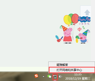 1、点击桌面右下角的“网络中心”图标,按右键选择“打开网络和共享中心”。如图所示: