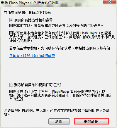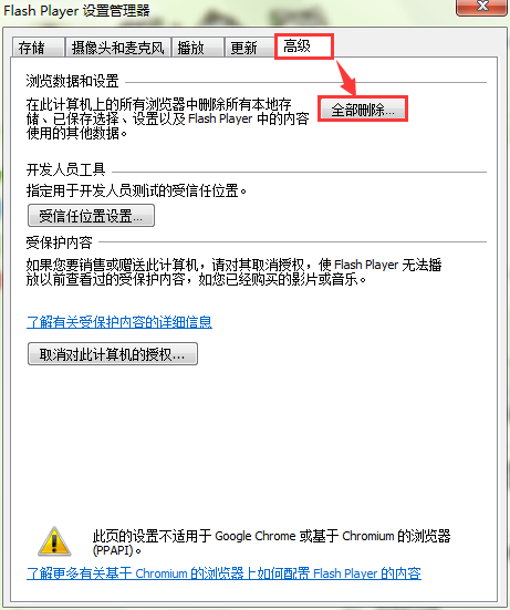 2、打开“Flash Player”设置管理器后,将选项卡切换至“高级”。然后再在“浏览数据和设置”处将数据“全部删除”。如图所示: