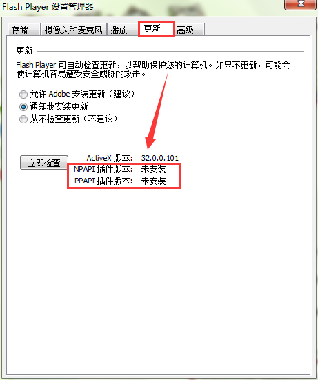 4、删除完数据后,将选项卡切换至“更新”界面查看到插件版本未安装,不需要一步一步的更新。如图所示: