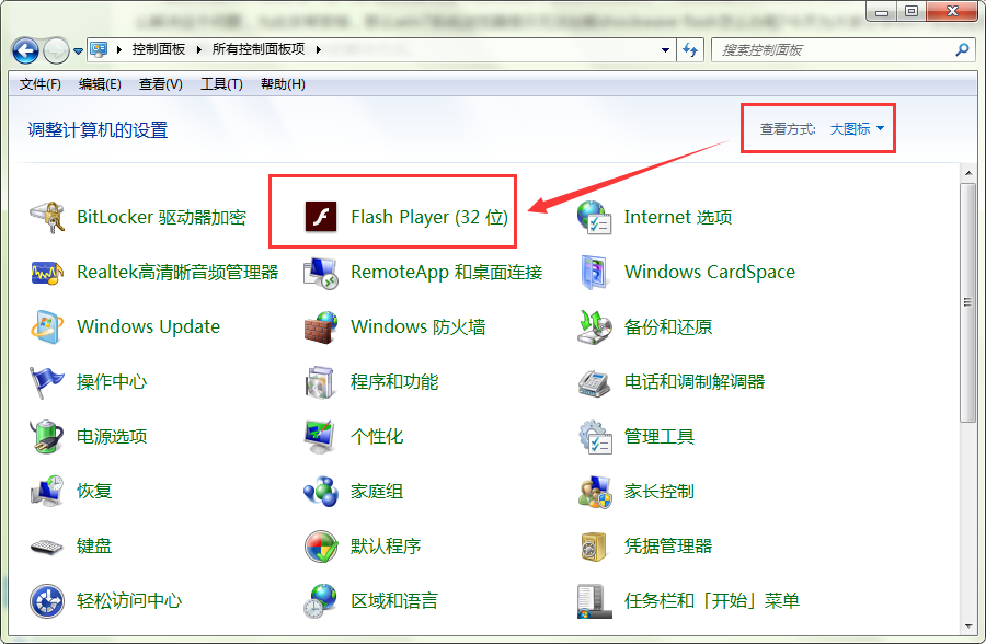 1、首先,点击桌面左下角的“开始”菜单,选择“控制面板”。打开“控制面板”页面后,选把右上角的查看方式改为“大图标”,然后点击打开“Flash Player(32位)”。如图所示: