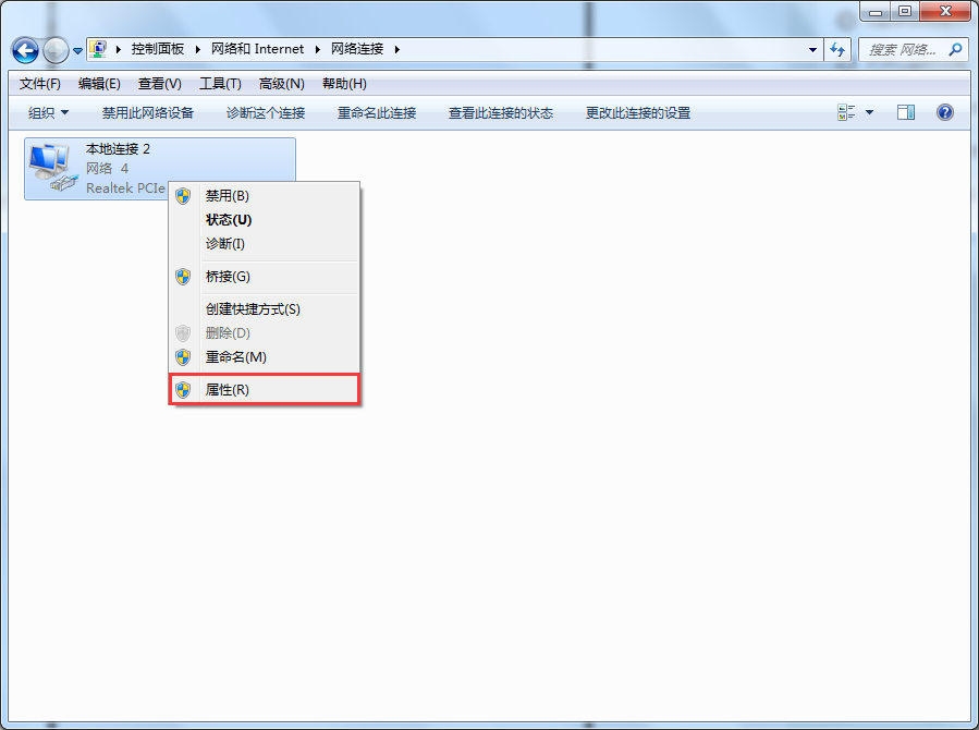 3、接下来,在打开的网络连接页面,将鼠标光标置于“本地连接2”图标上,右击鼠标,选择打开“本地连接2的属性”。如图所示: