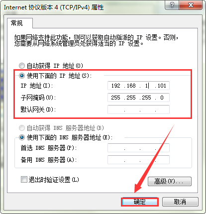 6、勾选完“使用下面的IP地址”选项后,在“IP地址”和“子网掩码”处分别输入“192.168.1.101”和“255.255.255.0”.如图所示: