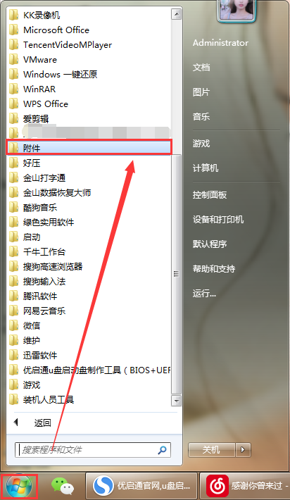 1、首先,点击桌面左下角的“开始菜单”按钮,找到并点击打开“附件”。如图所示: