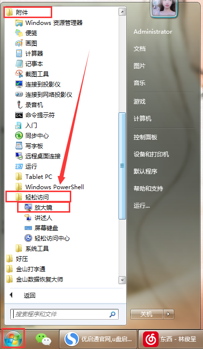 2、接下来,找到并打开“附件”——“轻松防伪标”——“放大镜”。如图所示: