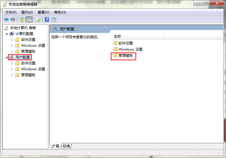 2、打开“本地策略编辑器”窗口后,点击“用户配置”——“管理模板”。如图所示: