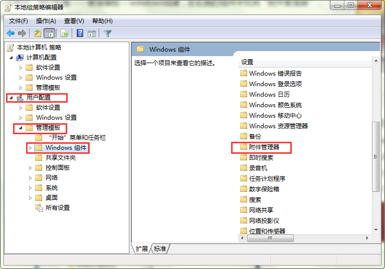 3、打卡“管理模板后”,继续单击鼠标选择“Windows组件”——“附件管理器”。如图所示: