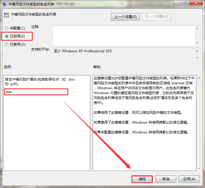 5、打开“中等风险文件类型的包含列表”窗口后,先把状态改为“启用”。再在如图方框中输入“.exe”即可。如图所示: