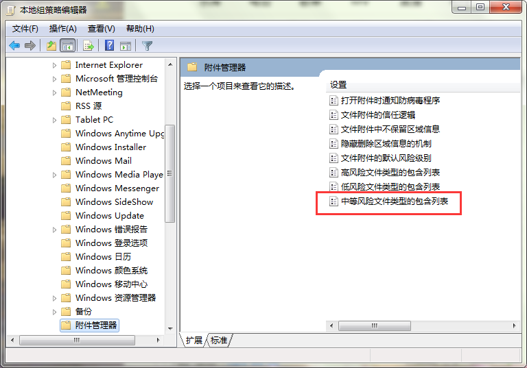 4、打开附件管理器后,再继续选择“中等风险文件类型的包含列表”。如图所示: