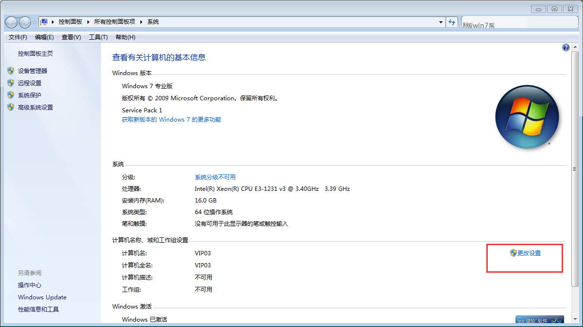 2、接下来,在打开的”控制面板——系统“窗口中,点击选择”更改设置“。如图所示: