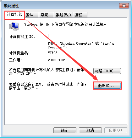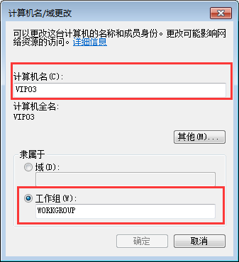 4、最后,在”计算机名/域更改窗口,“计算机名”处输入“计算机名。再将隶属于状态更改为”工作组”,然后在工作组方框出输入“WORKGROUP”,按“Enter”键即可。如图所示: