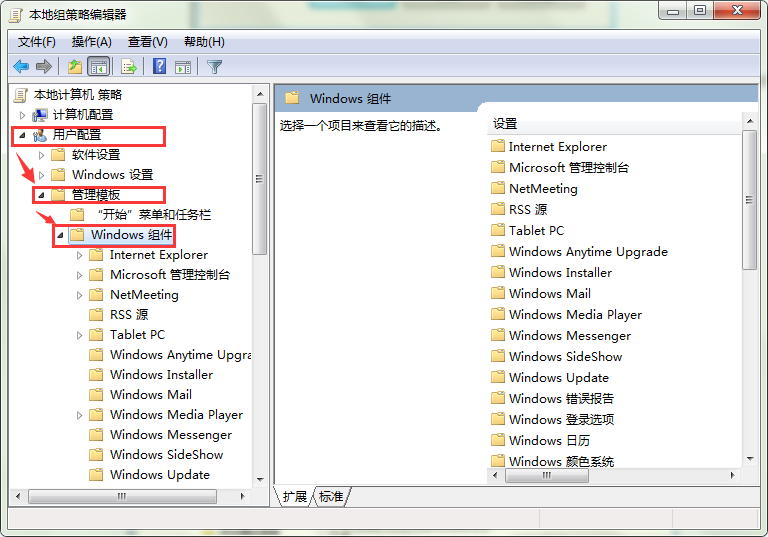 2、打开“本地策略组编辑器”后,选择“用户配置”——“管理模板”——“Windowsz组件”。如图所示“”