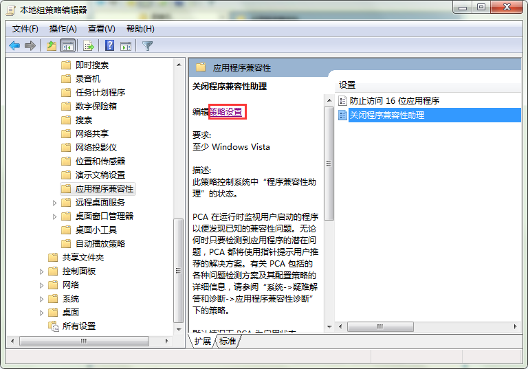 3、在“Windowsz组件”下找到“应用程序兼容性”,然后点击打开“策略设置”。如图所示: