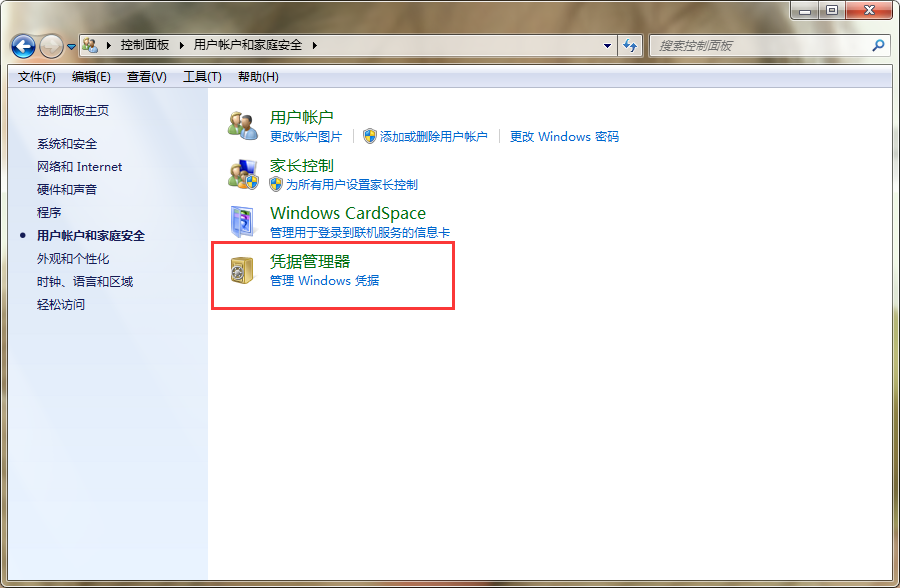2、打开“用户账户和家庭安全”的页面窗口后,点击选择“凭据管理器”。如图所示: