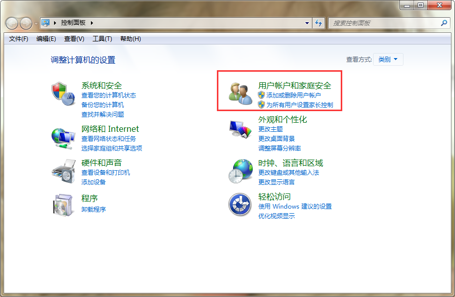 1、首先,点击桌面左下角的“开始菜单”按钮,再将查看方式修改为“类别”,然后选择“用户账户和家庭安全”。如图所示: