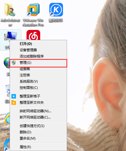 1、首先,在系统桌面找到计算机,将鼠标置于“计算机”图标上,右击鼠标,选择打开“管理”。如图所示:
