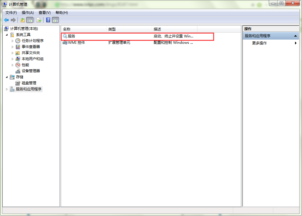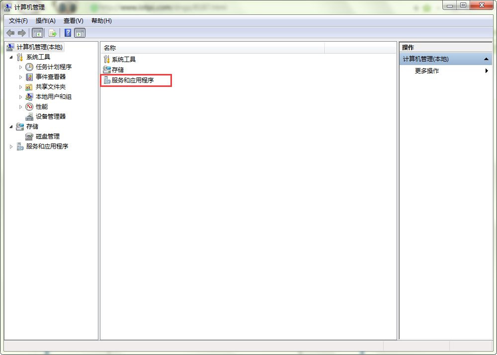 2、打开“计算机管理”页面后,在页面右侧选择并打开“服务和应用程序”——“服务”。如图所示: