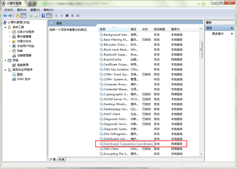 3、打开服务选项后,在页面右侧找到并双击打开“Distributed Transaction Coordinator”服务。如图所示: