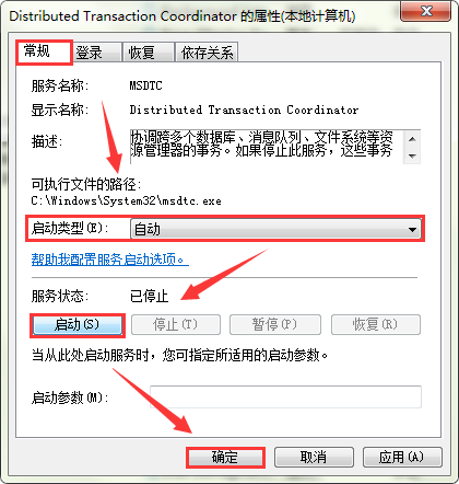 4、打开“Distributed Transaction Coordinator的属性”窗口,选择“常规”选项卡,然后将启动类型修改为“自动”,再点击“启动”——“确定”即可。如图所示: