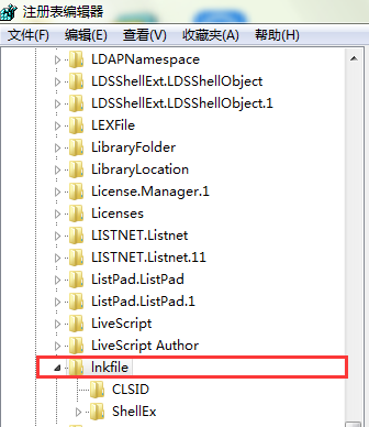 3、选择完“HKEY_CLASSES_ROOT”根键后,再下拉选项选择“Lnkfile”选项。如图所示: