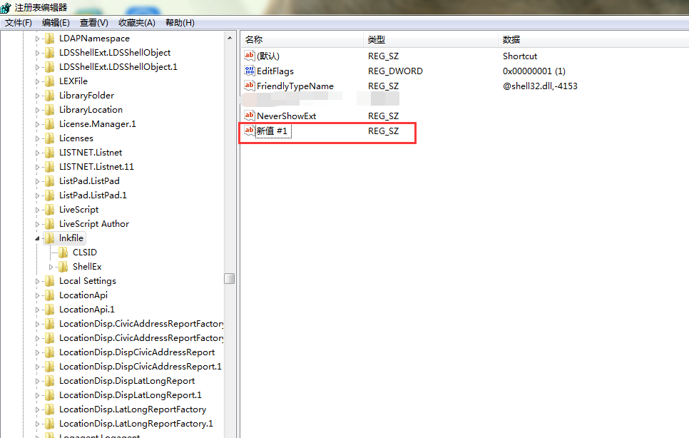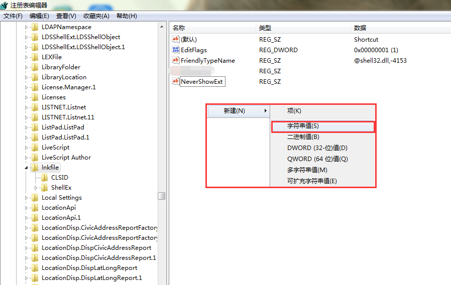 4、选择完“Lnkfile”选项后,在“注册表编辑器”页面右侧任意处,右击鼠标选择“新建”——“字符串值”。如图所示: