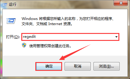 1、首先,按“WIN”+“R”组合件打开“运行”窗口,在图示方框处输入“regedit”,再点击“确定”。如图所示: