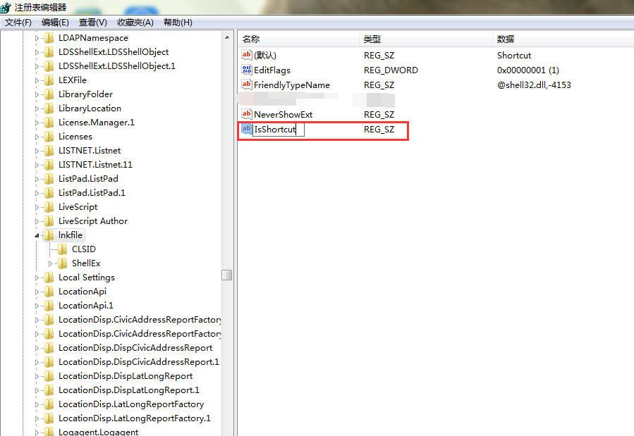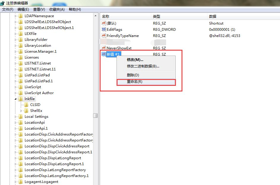 5、新建号字符串值时我们需要重命名,因为一般新建的字符串值名字都默认为“新值#1”。将鼠标置于“新值#1”上,右击鼠标,选择“重命名”,将文件名称修改为“IsShortcut”。如图所示: