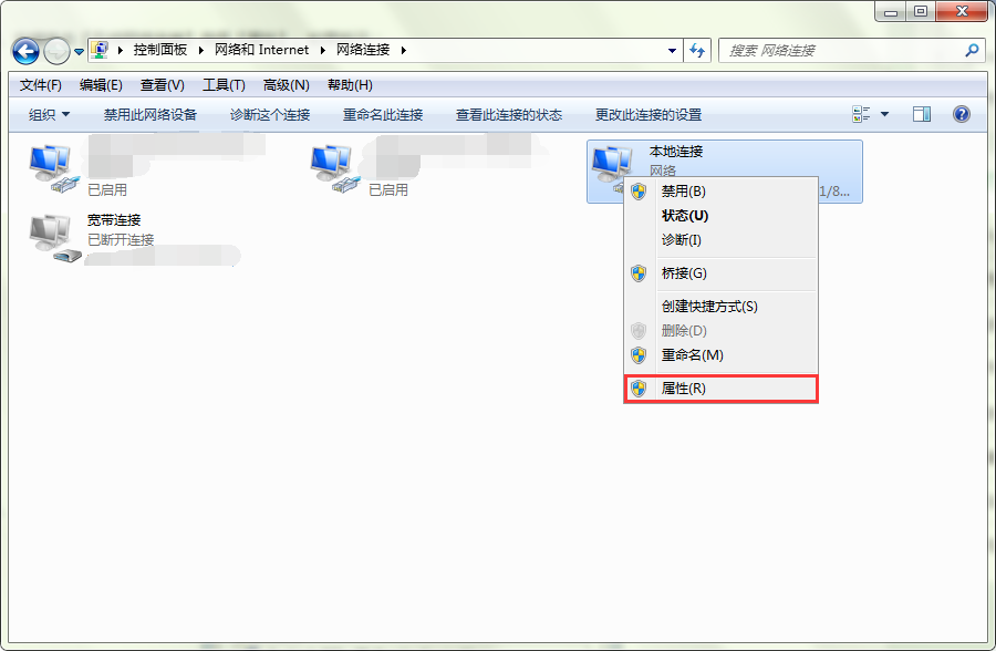 4、打开“网络连接”后,将鼠标置于“本地连接”图标上,右击鼠标选择打开“属性”。如图所示: