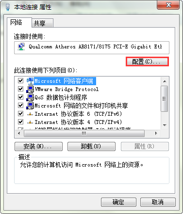 5、打开“本地连接属性窗口”后,点击“配置”。如图所示: