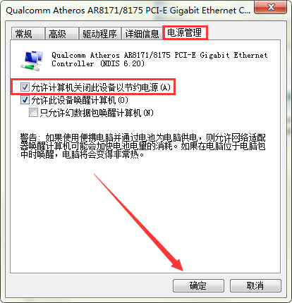 6、将选项卡切换至“电源管理”,然后取消勾选“允许计算机关闭此设备以节约电源”即可。如图所示: