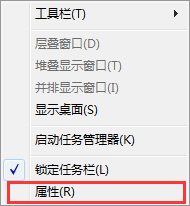 2、除了上述操作方法,我们还可以将“运行”选项重新添加系统的开始菜单。首先,在桌面通知栏处右击鼠标,选择“属性”。如图所示: