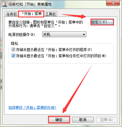 3、打开“属性”窗口后,将选项卡切换至“【开始】菜单”选项,然后点击自定义。如图所示: