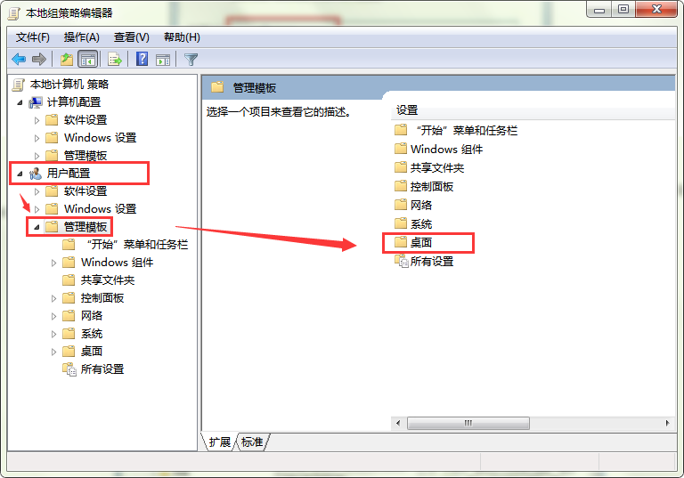 2、进入本地组策略编辑器后,选择“用户配置”——“管理模板”——“桌面”。如图所示: