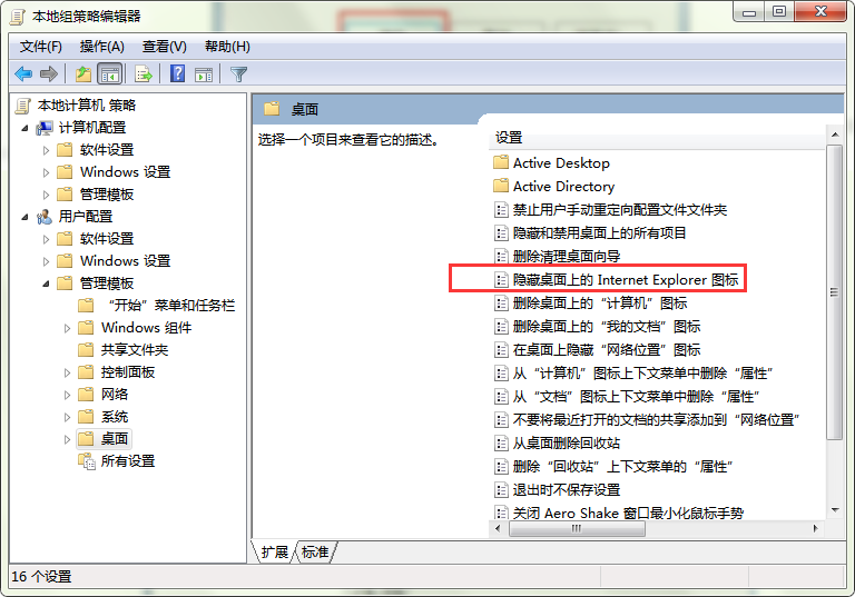 3、打开“桌面”文件夹后,点击打开“隐藏桌面上的Intermet Explorer图标”选项。如图所示: