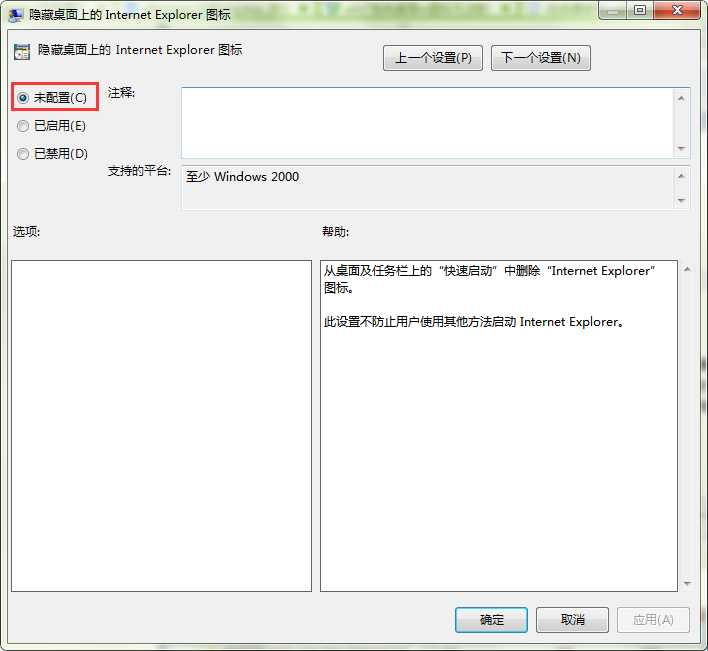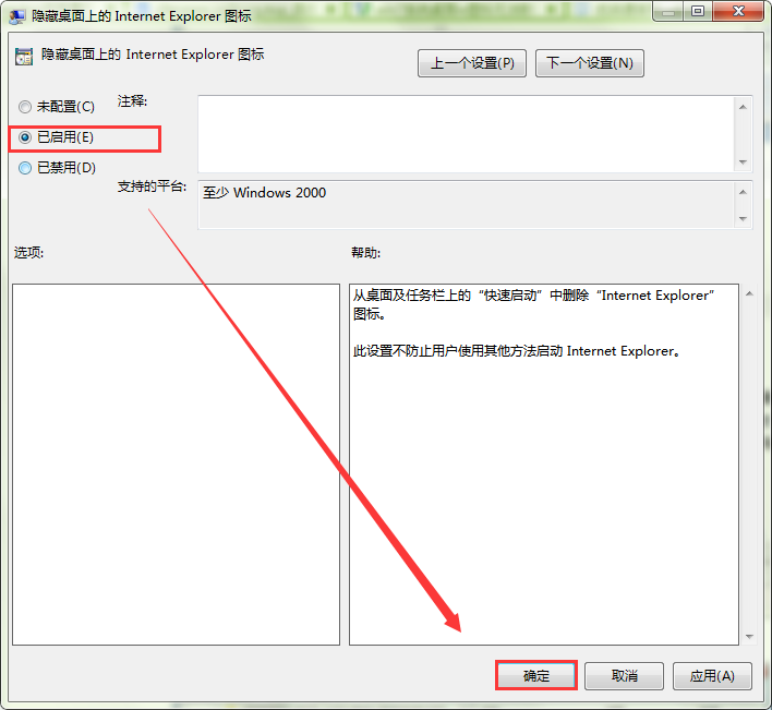 4、打开“隐藏桌面上的Intermet Explorer图标”页面后,将状态从“未配置”修改为“已启用”。如图所示: