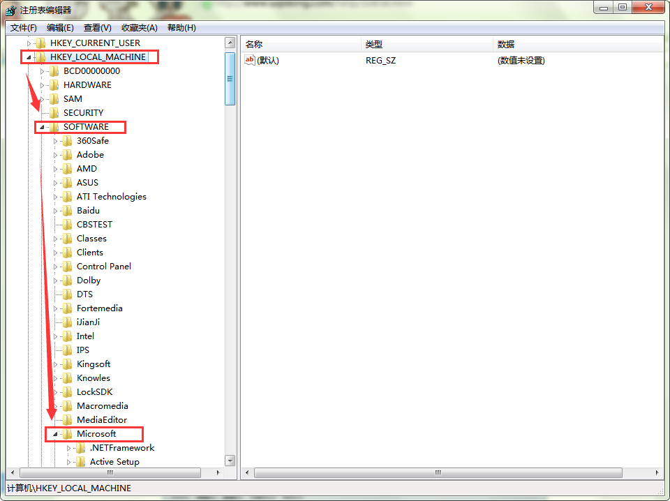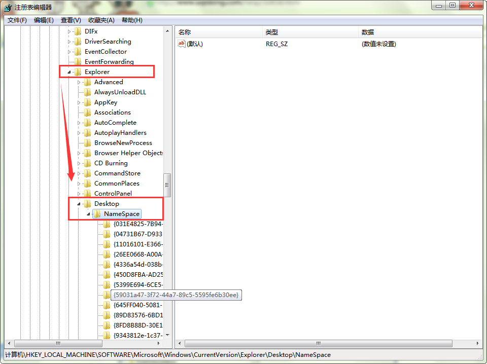 2、打开“注册表编辑器”后,依次开“HKEY_LOCAL_MACHINE\SOFTWARE\Microsoft\Windows\CurrentVersion\Explorer\Desktop\NameSpace”。如图所示: