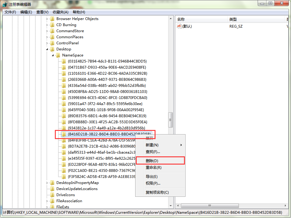 3、上述操作完成后,最后一步找到名为“{B416D21B-3B22-B6D4-BBD3-BBD452DB3D5B}”的选项,右击鼠标,选择“删除”。如图所示: