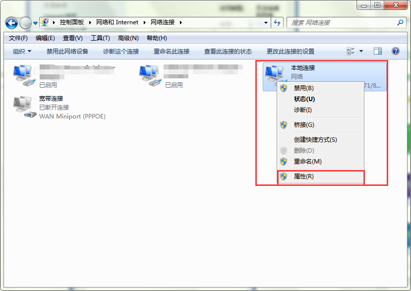 2、打开“网络连接”窗口后,选择“本地连接”,右击鼠标选择打开“属性”。如图所示: