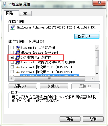 3、最后,在本地连接属性窗口,在网络选项卡,将“此连接使用下列选项”处的全部勾选取消掉,仅保留“QOS数据包计划程序”项。按“Enter”键确定保存设置。设置完成后,重新连接“宽带连接”即可。如图所示: