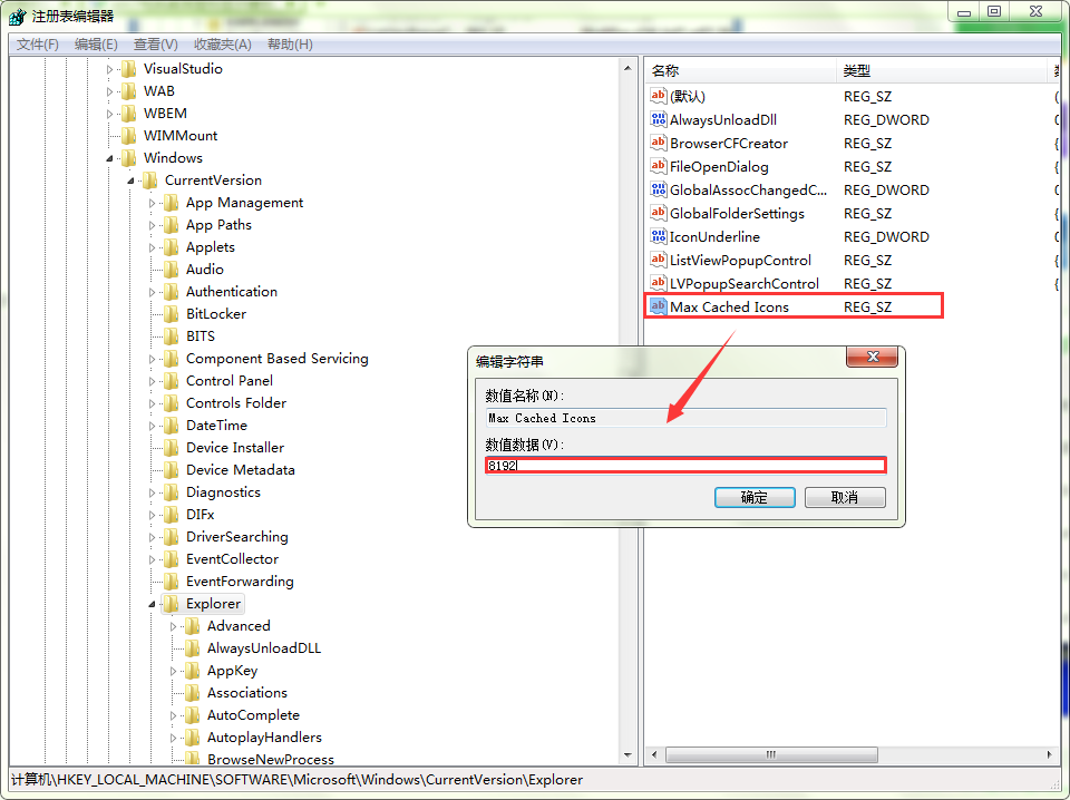 3、最后,双击“Max Cached Icons”编辑字符串值,将数值数据修改为“8192”,按“Enter”键确定即可。如图所示: