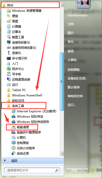 1、首先,点击桌面左下角的“开始菜单”,然后依次打开:“所有程序”——“附件”——“系统工具”——“磁盘清理”。如图所示: