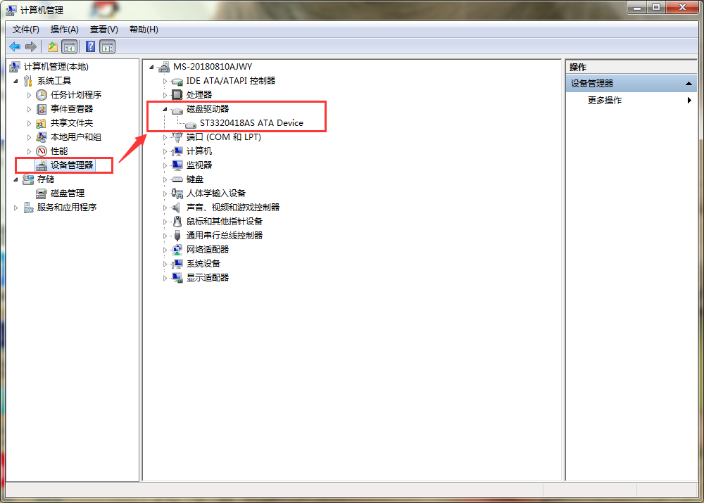 2、接下来,在打开的“计算机管理”窗口,依次选择“设备管理器”——“磁盘驱动器”——“ST3320418AS ATA Device”。如图所示: