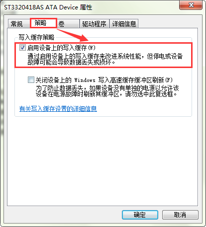 3、最后,在打开的“ST3320418AS ATA Device属性”窗口,勾选“启用设备上的写入缓存”即可。如图所示: