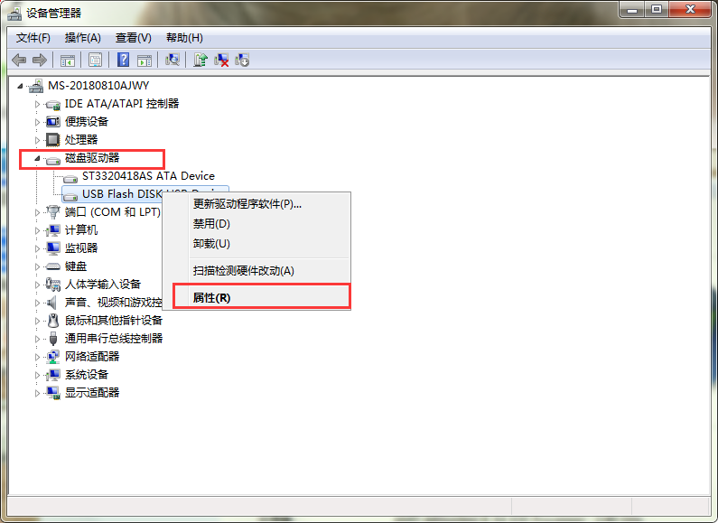 3、打开“设备管理器”后,找到你移动硬盘所在的选项,右击鼠标选择并打开“属性”(小编以“USB Flash DISK USB Device”为例)。如图所示: