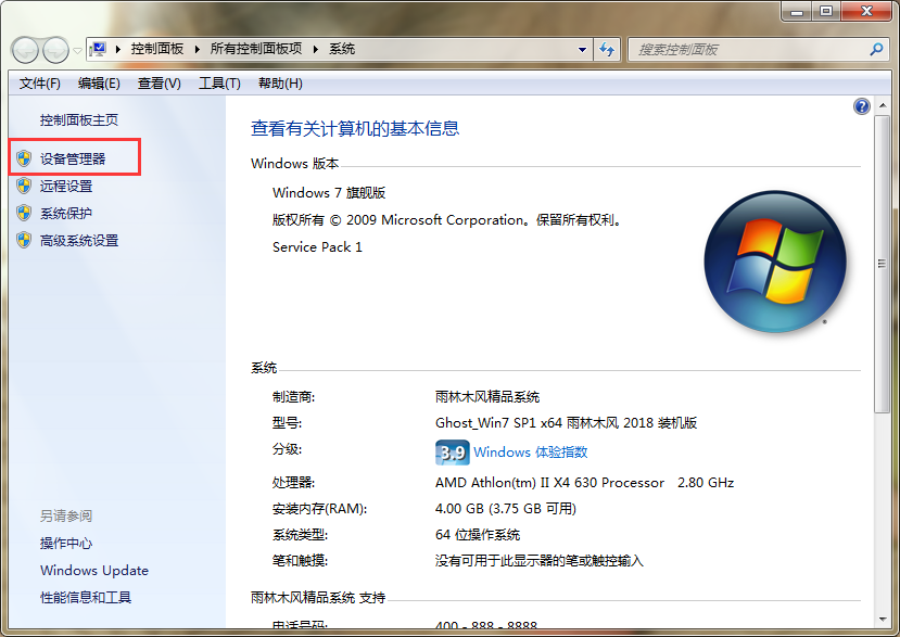 2、接下来,在打开的“系统”窗口中,选择左列的“设备管理器”。如图所示: