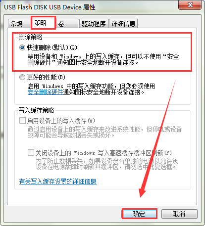 4、最后在打开的“USB Flash DISK USB Device属性”窗口,将选项卡切换至“策略”,勾选“删除策略”选项下的“快速删除(默认)”即可。如图所示: