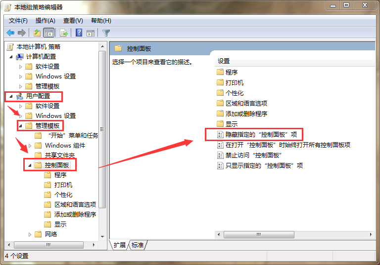 2、接下来,在打开的“本地组策略编辑器”左侧依次打开“用户配置”——“管理模板”——“控制面板”。再在“控制面板”选项右侧找到并双击“隐藏指定的“控制面板项”。如图所示: