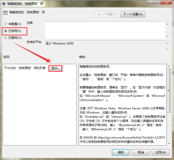 3、在打开的“隐藏指定的“控制面板”项”窗口,勾选“已启用”然后点击下面的“显示”。如图所示: